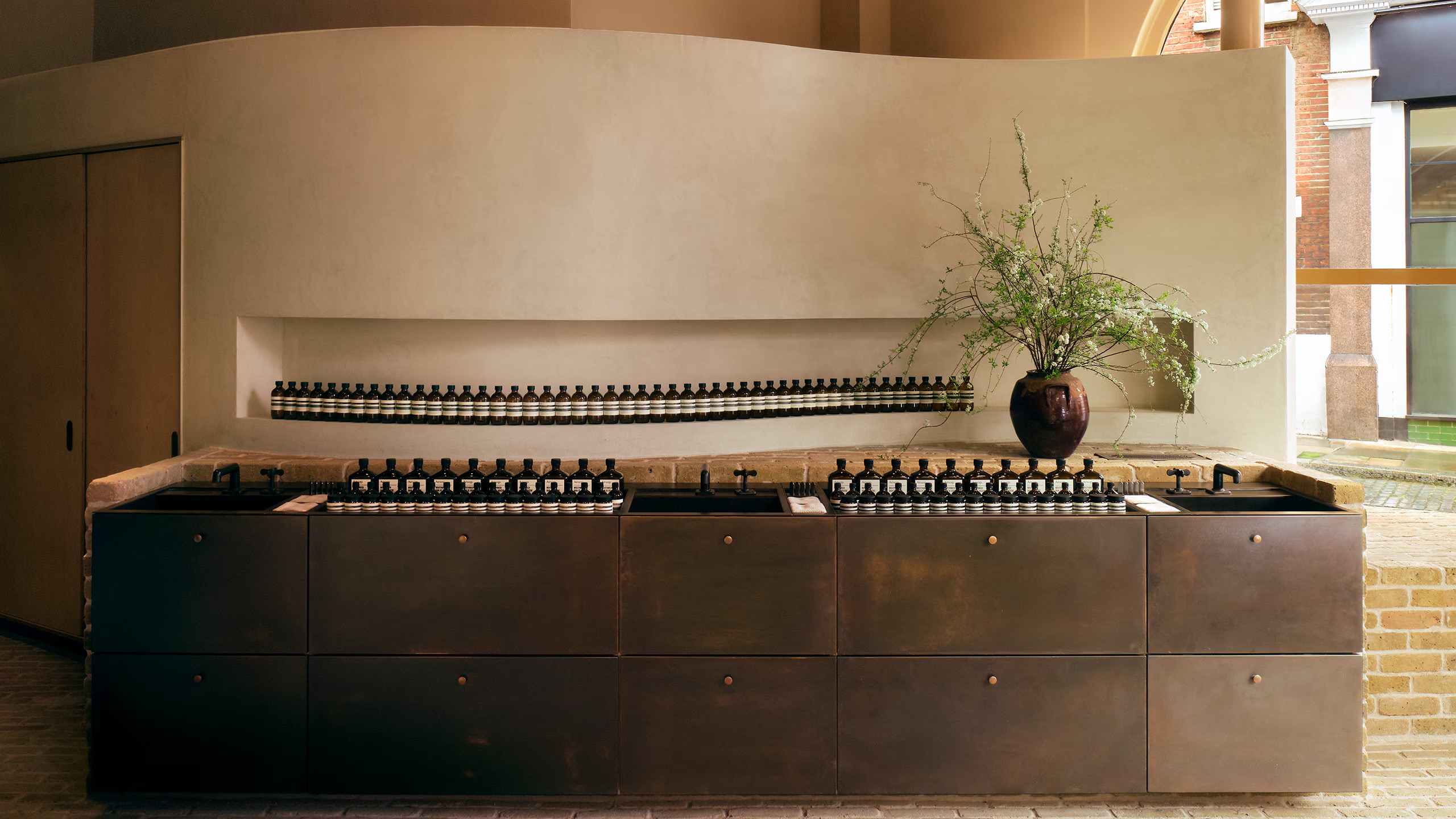 Working with the brand’s in-house architect Mathilde Lee and European design team Jean-Philippe Bonnefoi and Herbie Rhodes, we provided a distinctive, textured look using brick slips on the floors, walls, counters, and window bays.