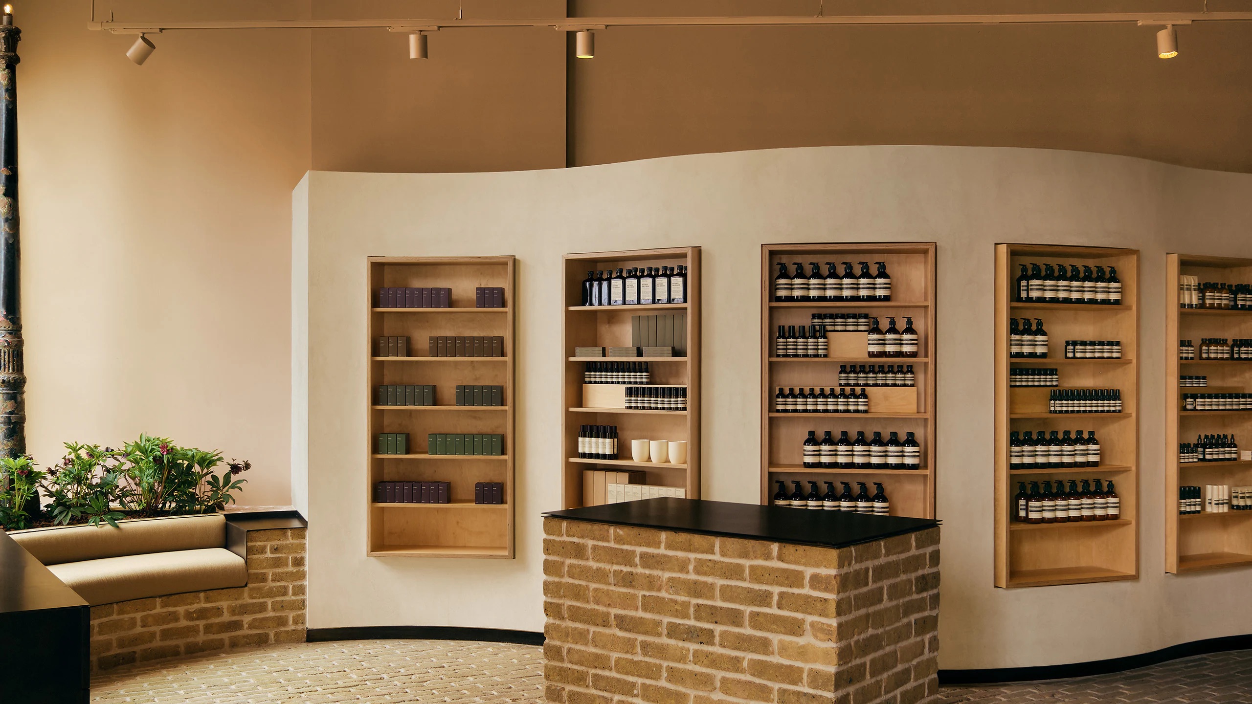 The textured brick elements add a warm character that complements the brand's sophisticated design vision for its Islington shop.