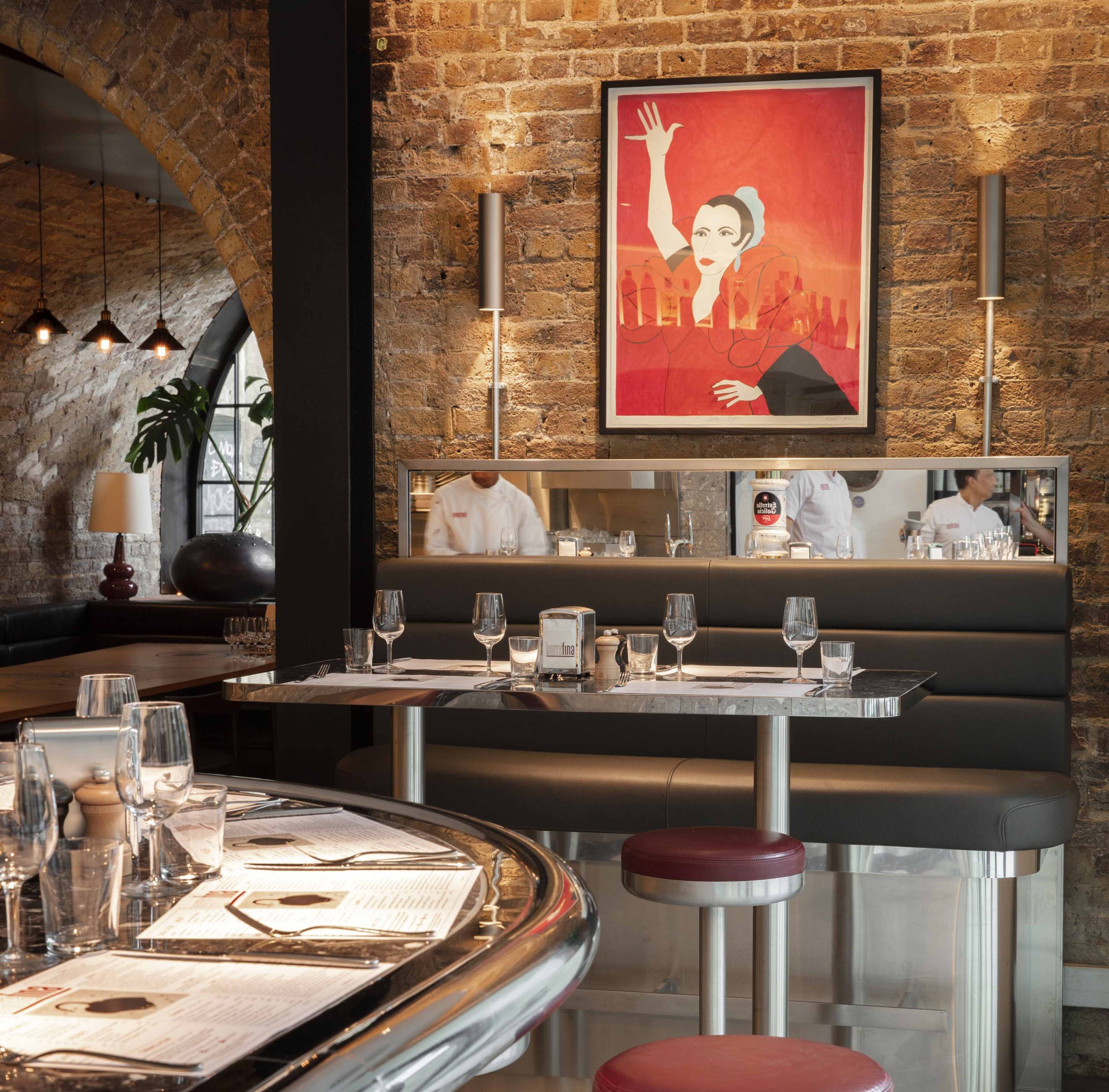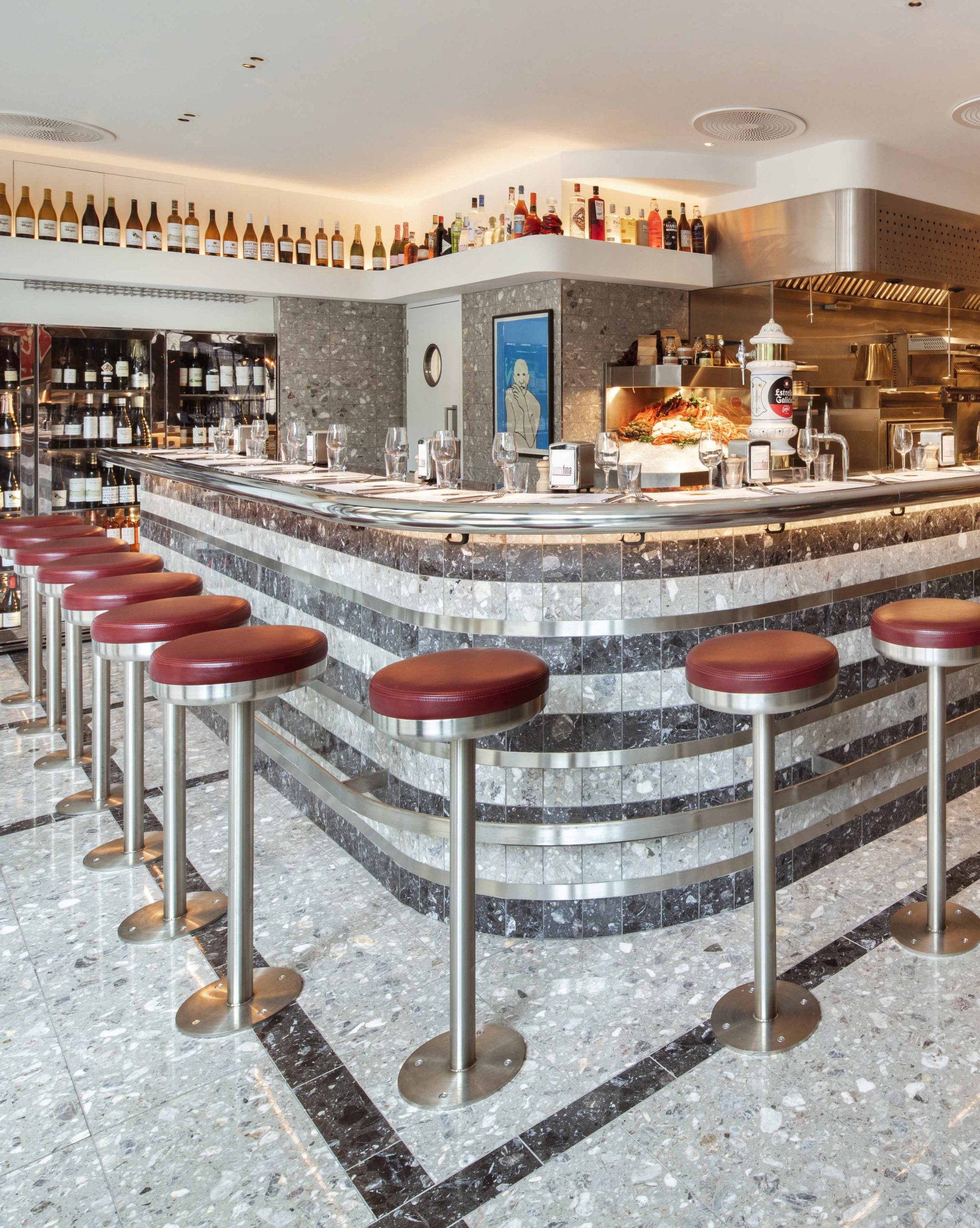 In 2018, we completed a four-week installation at Barrafina in Coal Drops Yard with bespoke Grigio Carnico and Fior de Bosco marble for the floors, walls and theatrical kitchen bar, as well as bespoke stone in the bathrooms.