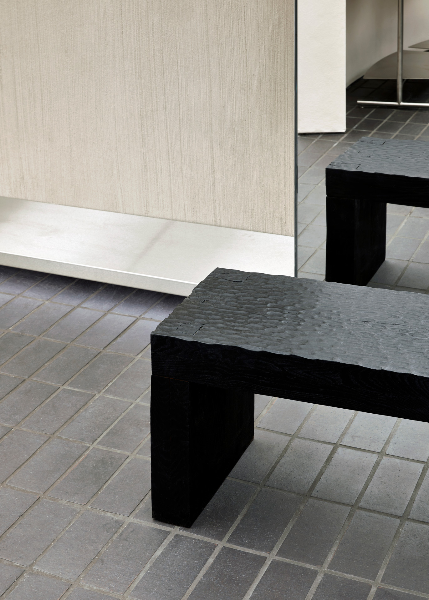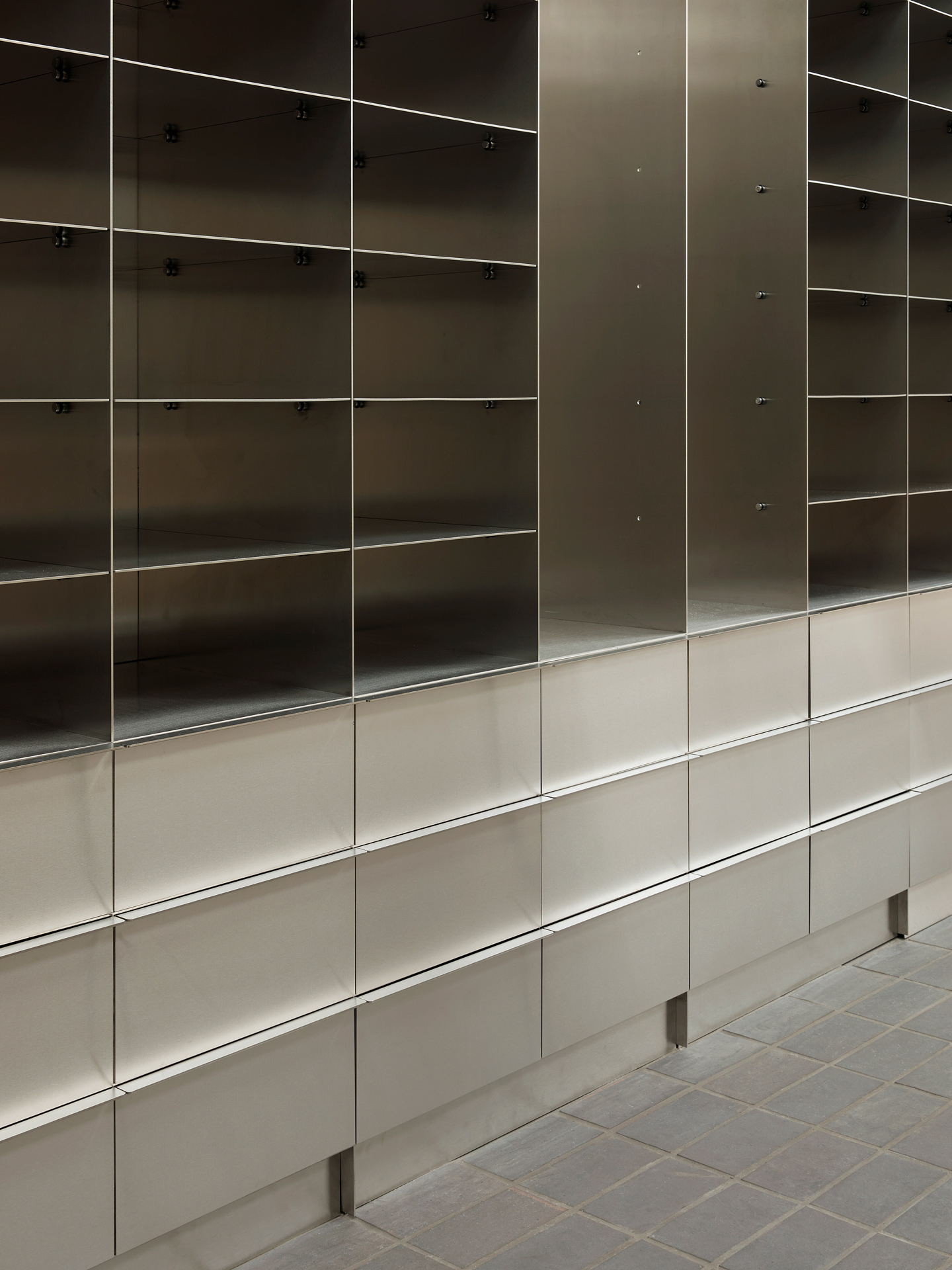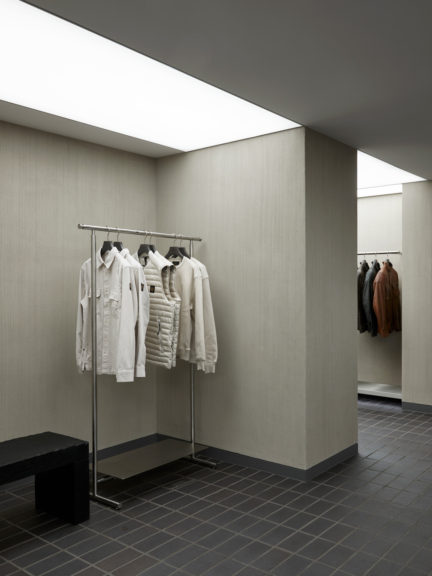 The exposed brick surfaces establish an industrial aesthetic that references Belstaff’s roots in Staffordshire – the bricks were made just 30 miles away from Belstaff’s original site. Materials were sourced from Ketley Brick through Solus Tiles in Clerkenwell. We also used technical materials from Mapei, Kerakoll, and Schlüter Systems.