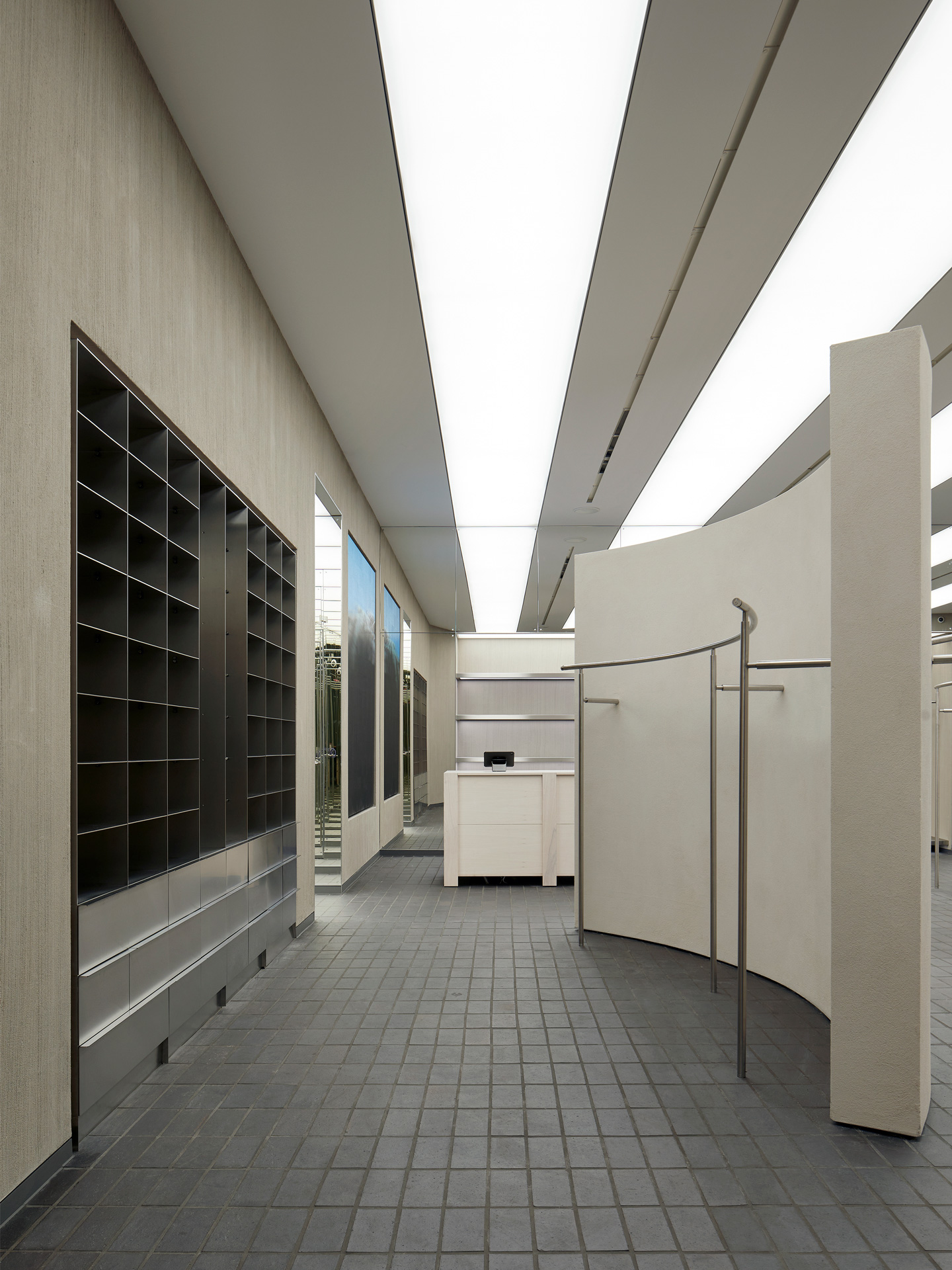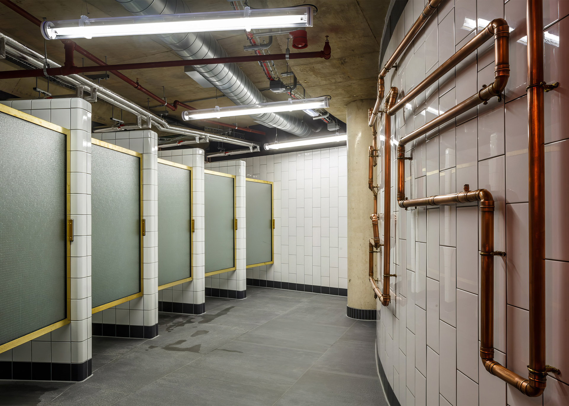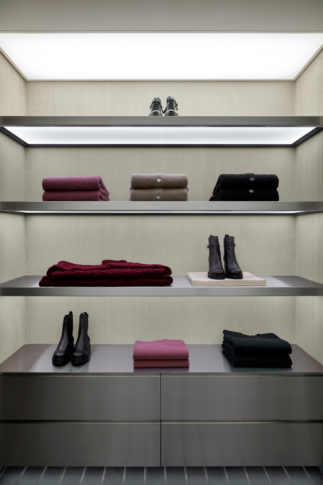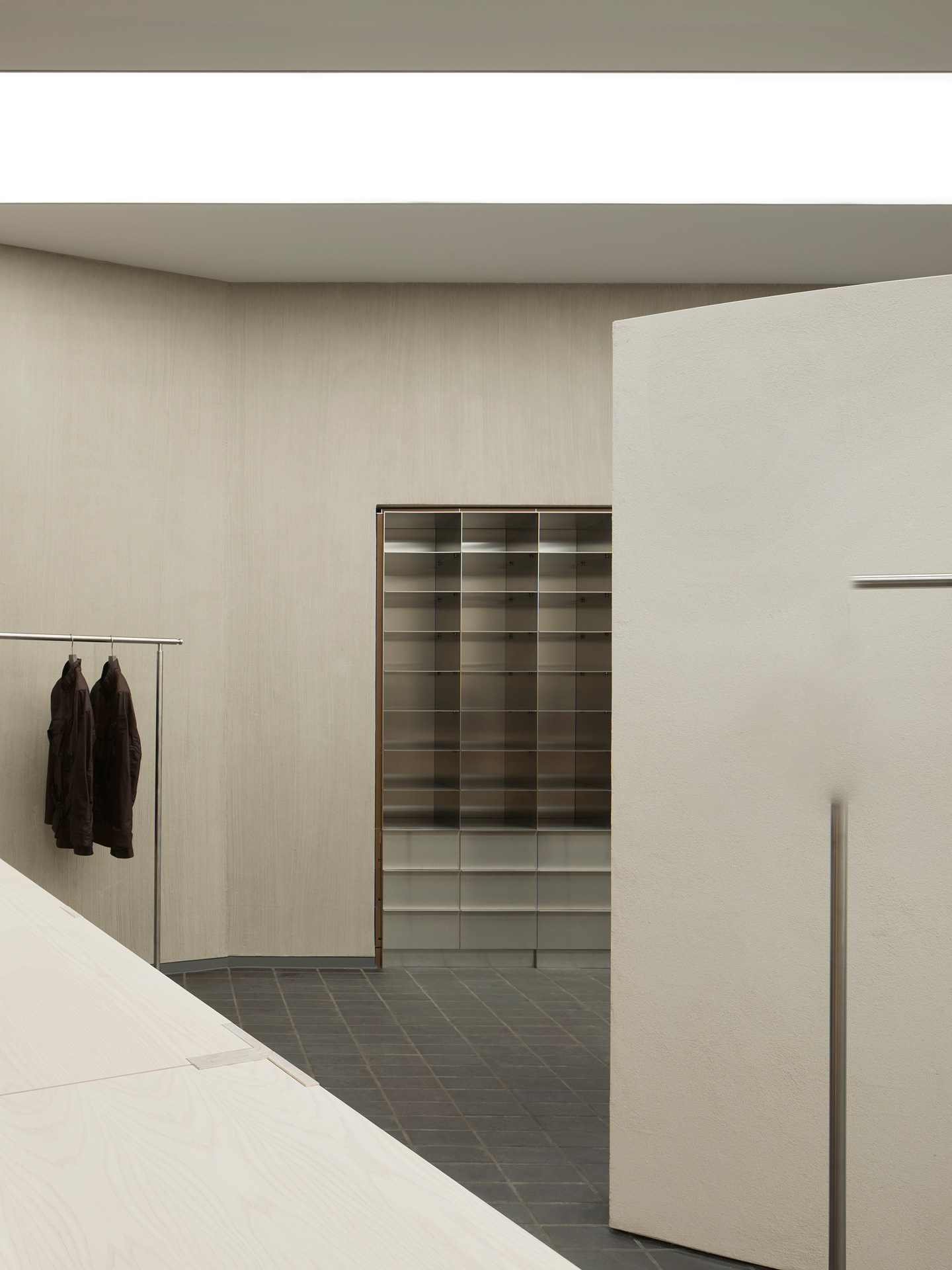 The exposed brick surfaces establish an industrial aesthetic that references Belstaff’s roots in Staffordshire – the bricks were made just 30 miles away from Belstaff’s original site. Materials were sourced from Ketley Brick through Solus Tiles in Clerkenwell. We also used technical materials from Mapei, Kerakoll, and Schlüter Systems.